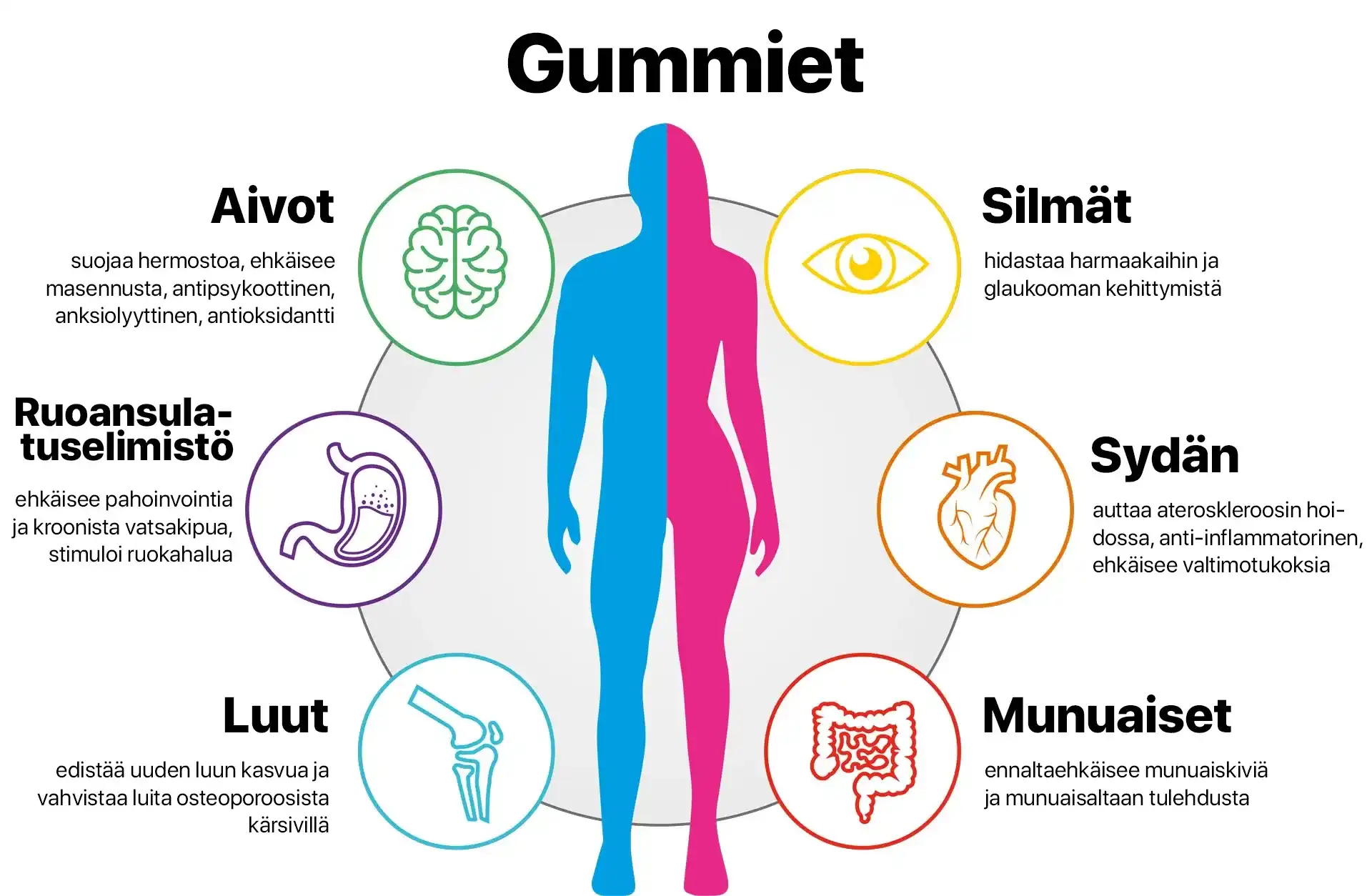 Gummiet:n tärkein etu on, että se voi auttaa monenlaisiin vaivoihin. Tällä kehon endojärjestelmään () kohdistuvalla aineella on positiivinen vaikutus kehon eri alueisiin ja toimintoihin: